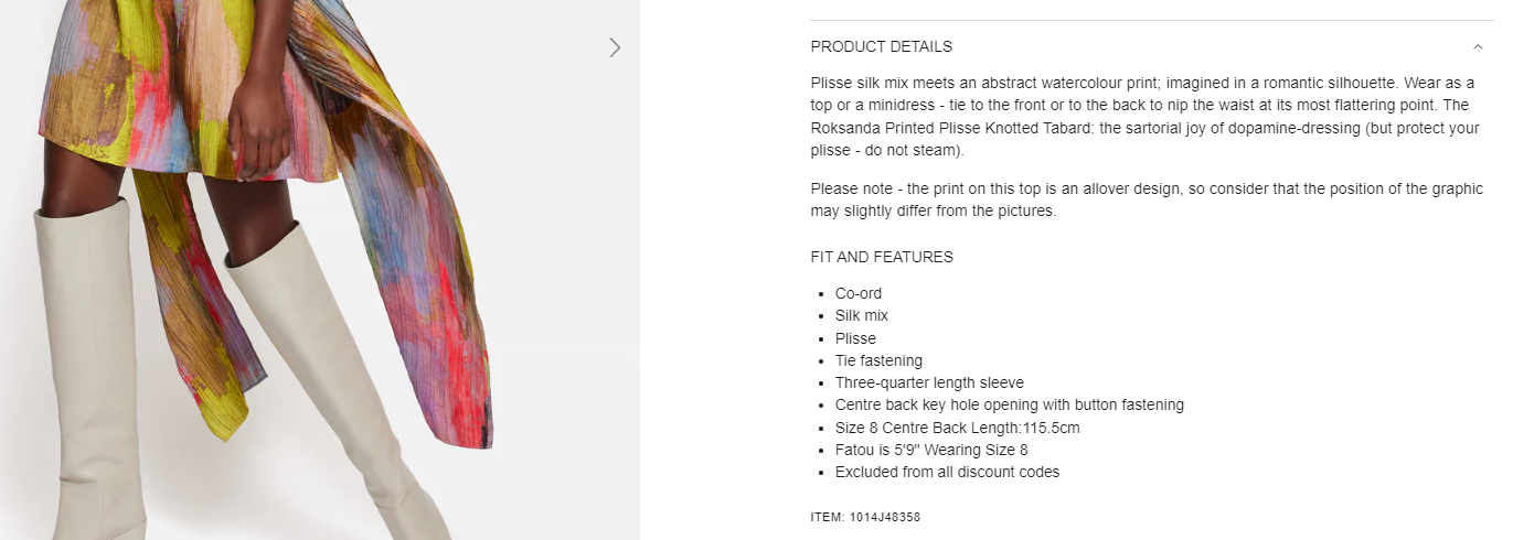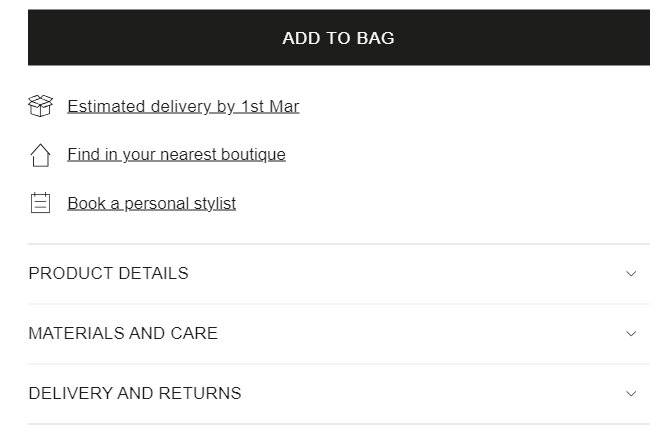 Additionally, more detailed information regarding the fit and fabric can be found in a box located below the options for size and colour. If you require further information that is not available on the website, please feel free to reach out to our boutiques for assistance or our Customer Experience Team.